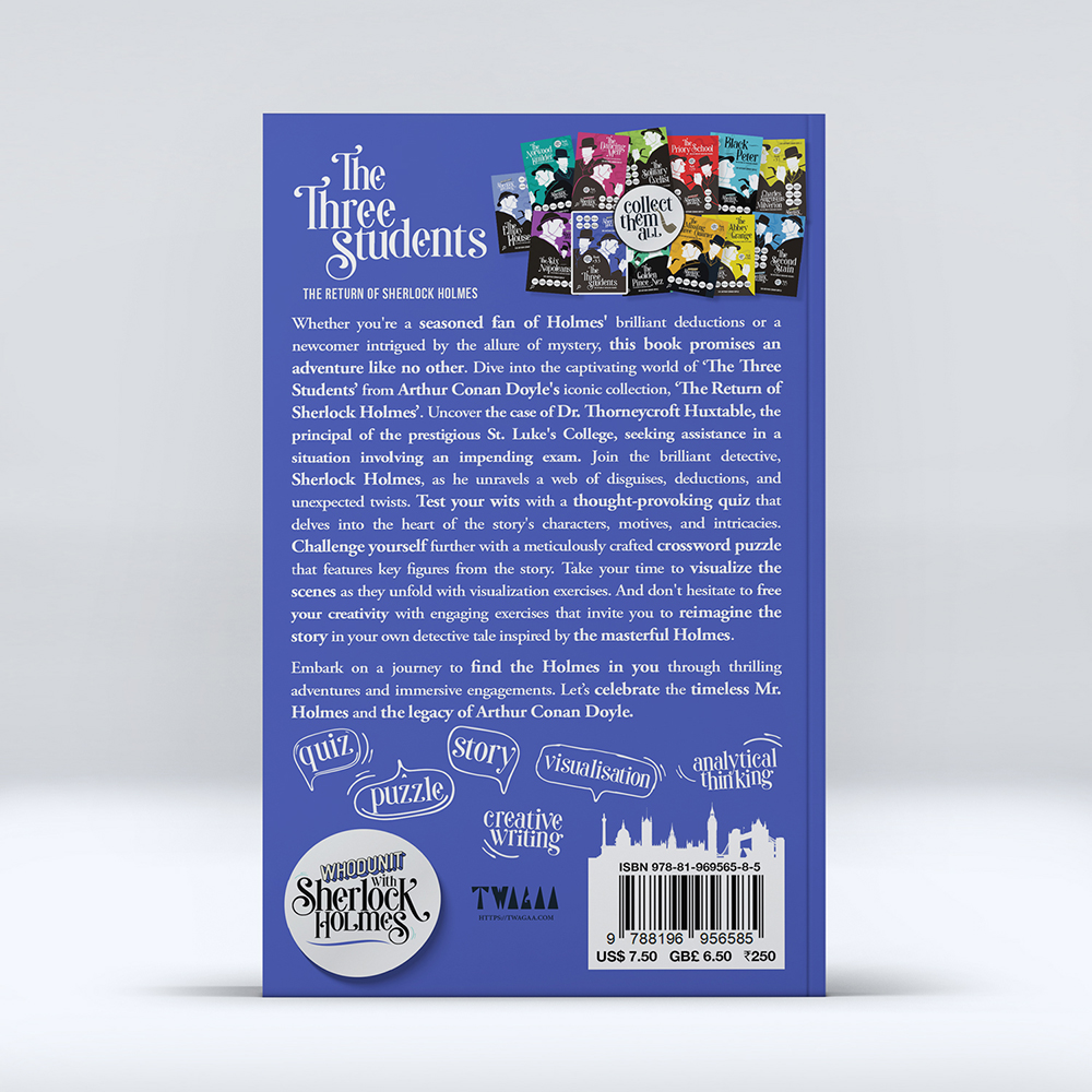 Whether you count yourself a seasoned aficionado of Holmes’ ingenious deductions or an intrigued newcomer captivated by the allure of enigma, the “WHODUNIT with Sherlock Holmes” series assures an escapade like no other. Celebrate the undying legacy of Sherlock Holmes and the captivating story meticulously crafted by Arthur Conan Doyle, followed by the key highlights, learnings, quizzes, puzzles, analysis, and visualization exercises for each story. The WHODUNIT series transcends the boundary of being a mere narrative; and is an invitation to explore, learn, and fabricate within the realm of one of literature’s most iconic personas.